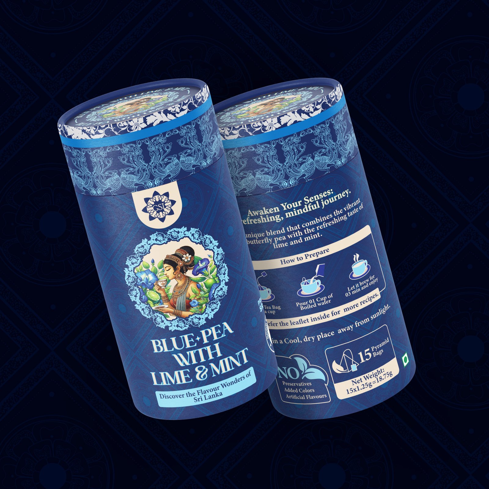 Our task was to design a visually striking packaging series for a premium line of Sri Lankan teas. The client sought a design that honored the heritage of Ceylon tea while appealing to modern, global tea enthusiasts. We developed a set of richly illustrated, color-coded cylindrical containers—each representing a different flavor like Rose & Hibiscus, Blue-Pea with Lime & Mint, and Lavender & Lemon Peel.