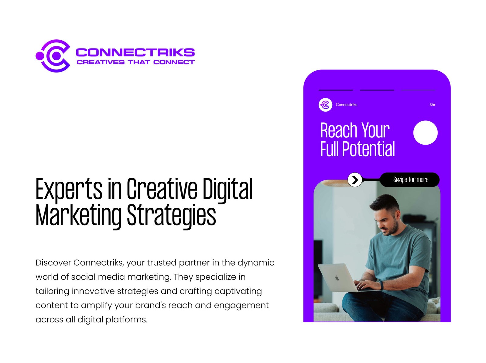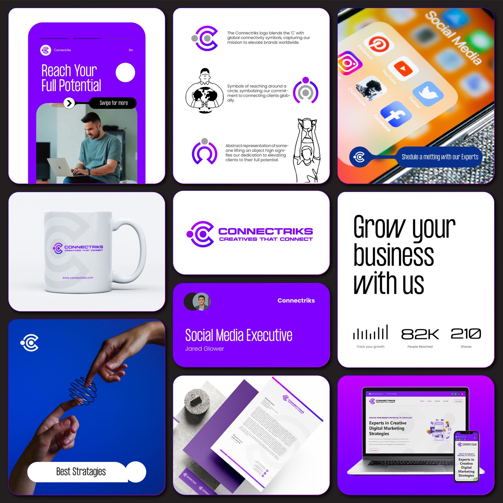 Overview: Connectriks is a tech-forward digital marketing agency specializing in driving connection through creativity and data. The client needed a bold identity to reflect their innovation-first mindset. We developed a futuristic and dynamic logo system that visually captures the idea of digital nodes, strategy, and connectivity. The identity uses vibrant purples and structured lines to stand out in a saturated market, while still feeling professional and scalable for tech presentations, web platforms, and client-facing assets.